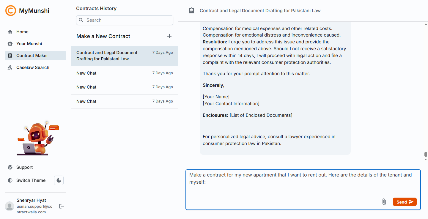 No. MyMunshi is not a law firm and does not provide legal representation. It’s a digital tool that supports research, drafting, and documentation within Pakistan’s legal framework. However, the brains behind MyMunshi are lawyers and they can assist you with legal matters. Get in touch at support@contractwalla.com
